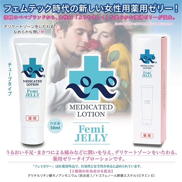潤い不足・摩擦による痛みなどに潤いを与え、デリケートゾーンをいたわわる、薬用ゼリータイプローションです。「フェミゼリー」は医薬部外品で、有効性と安全性があると認められています。2種類の有効成分を配合、グリチルリン酸モノアンモニウム(抗炎症)/トコフェノール酢酸エステル(ビタミンE)●80ml