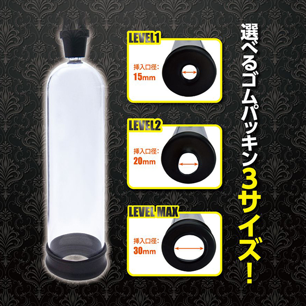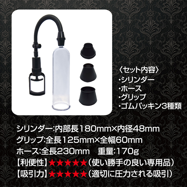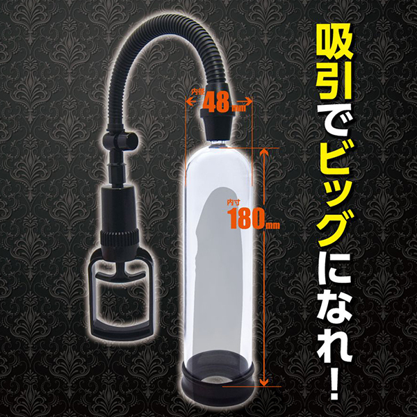 吸引でビッグになれ!強い男になるために開発された増大ポンプ「BIGBOY PUMP(ビッグボーイポンプ)」が新登場!簡単に片手で握れるトリガーレバーにワンプッシュの圧力開放ボタン、さらには大きさが目で分かる透明シリンダー、サイズが選べる3種類のゴムパッキンと操作性や視認性も抜群♪必要なものがすべて揃っていて、あとはレバーを握って空気を吸って、吸引圧力でメンズをビッグにするだけ!トリガーレバーは手動式なので微細な調整もコントロールも簡単♪圧力開放ボタンは安心設計でワンプッシュで吸引キャンセル!シリンダーは憧れサイズにぴったりな内寸長180ミリ×内径48ミリとなっています。挿入口のゴムパッキンは、選べる3サイズ(15ミリ、20ミリ、30ミリ)!シンプルながらもじっくり増大を計画しているならおすすめです♪ |