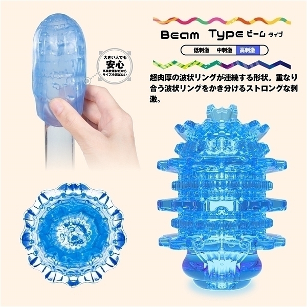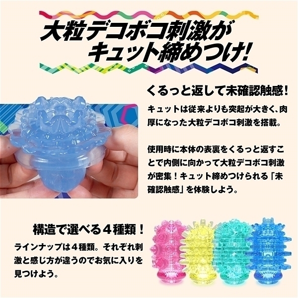 大粒デコボコ刺激がキュット締めつけ!裏返す事で未知なる体験と利便機能を持った変化する密集体ホール。「Qutto−キュット−」は従来よりも突起が大きく、肉厚になった大粒のデコボコ刺激を搭載。使用時に本体の凹凸面を内側に返すことで、内側に向かって大粒のデコボコ刺激が密集。キュット締めつけることで、「未確認の触感」を体験することができます。ビームタイプは、超肉厚の波状リングが連続する形状。重なり合う波状リングをかき分けるストロングな刺激。この商品には個装のローションが付属しています。 |