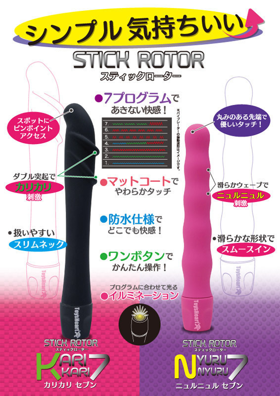 トイズハート社から、スリムな見た目でも高刺激を味わえるスティック型ローター「ニュルニュルセブン」が発売されました!スベスベのフォルムでスムーズな挿入が可能な15cmの長さと23mmの最大径で、波打つうねり形状が快感を演出します。7種類の振動と連動した光のイルミネーションも楽しめ、防水仕様で手軽にお手入れできるのも魅力です♪シンプルな操作性で使い勝手も良く、スタイリッシュなデザインもオシャレな一本です。 |