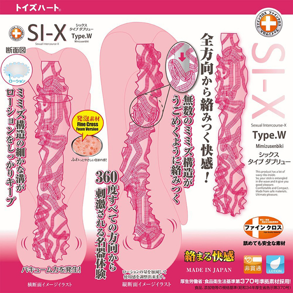 全方向から絡みつく触手の快感が超気持ちいい!一度使うと手離せなくなるほどハマっちゃう極上オナホール。●シックス・タイプ「W」ver●ふわっと優しく包み込む発泡素材を採用●内部:360℃配置した無数のミミズ千匹構造●細かな溝がローションをしっかりキャッチ●バキューム力も抜群●日本製・ローション付き。挿入直後から無数の触手がどこまでも絡みついてくる刺激たっぷりのオナホールです。 |