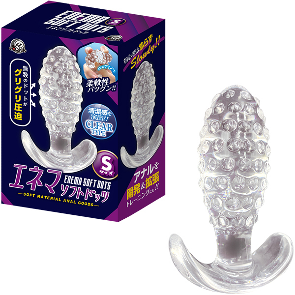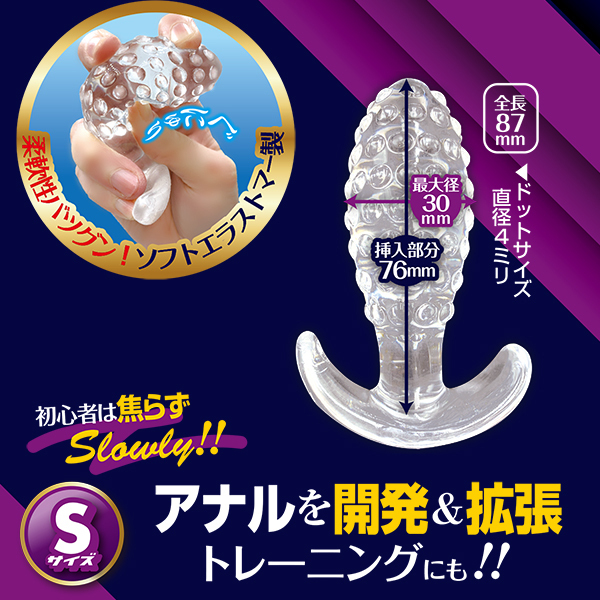 表面には無数のドットイボが配置されたアナルも悦ぶ「エネマソフトドッツS」です♪挿入部分の無数のドットがアナルにフィット!アナルの開発&拡張に最適なプラグで挿れやすくて抜けにくい設計♪これさえあればアナルプレイが存分に楽しめる!ソフトエラストマー製だから柔軟性も抜群で、丸洗いもできて何度も使用OK♪使いやすいストッパー付きで安心してプレイできます!見た目も美しいクリアタイプのアナルプラグで初心者向き♪まずはこれから挿れてみよう! |