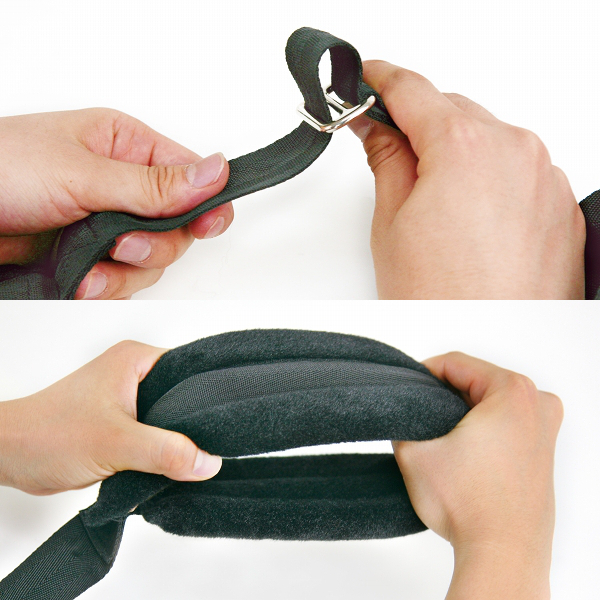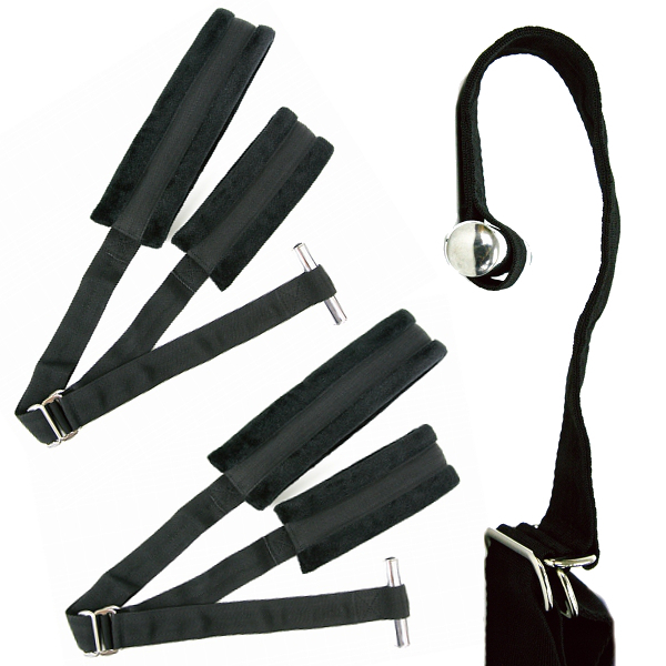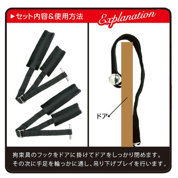 ドアの上部にフックを噛ませて腕と脚を固定!吊り下げ拘束が簡単にできるSMグッズ。初心者でも本格プレイが楽しめる、イーロックシリーズのドア腕・両足拘束具です。肌を痛めないようソフトな素材で作られ、体重の負荷を軽減させるため肉厚に仕立ててあり、縄で拘束するよりも負担が少ない簡易拘束具です。ドアの耐久性と吊り下げる人の体重を考慮して、安全にご使用ください。※設置場所の状態を確認してからご使用ください。 |