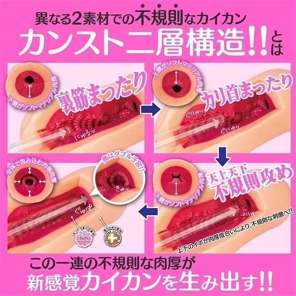 前半はドゥルドゥル、グニュグニュな強刺激!カリ首と裏筋に連続で押し寄せる連撃。奥にはランダムに現れる大粒のイボイボ!イボや壁には更に細かなつぶつぶが敷き詰められておりスキがない。最奥にはアナタを受け入れる準備万端のダブル子宮が待ち受ける! |