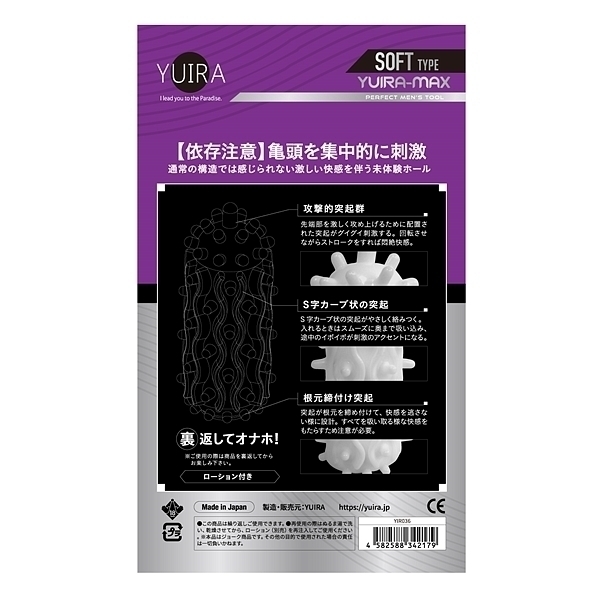 裏返してオナホ!あの人気商品とYUIRAのコラボ実現!簡易オナホがソフトバージョンで新登場!ハードと違い、やわらか素材でアナタを優しく包み込みます♪<選べる3タイプ><安心の日本製><ローション付き>依存注意、亀頭を集中的に刺激、通常の構造では感じられない激しい快感を伴う未体験ホール、攻撃的突起群、先端部をグイグイ刺激する突起配置。回転させながらのストロークで悶絶快感。S字カーブ状の突起、途中のイボイボが刺激のアクセントに。S字カーブ突起がやさしく絡みつき奥まで挿入をスムーズにサポート。根本締付け突起−突起が根元を締付け快感を逃さない安定設計。全吸収する様な快感を伴うため注意が必要。※ご使用の際は本商品を裏返してからお楽しみください。 |