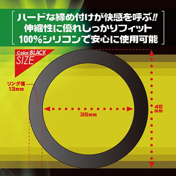 リングの厚み13mm!ハード系シリコンでギュッと締め付ける、シンプルなブラックコックリング。竿と玉袋を通してペニスの根元から締め付ける!φ35mmの内径、適度な伸縮性を持ち、様々なムスコにフィットしてくれます。パートナーとのセックスやオナホールを使った自慰にて使ってみてください!硬く勃起したペニスは、いつもより感じやすくタフになっているはずです。 |