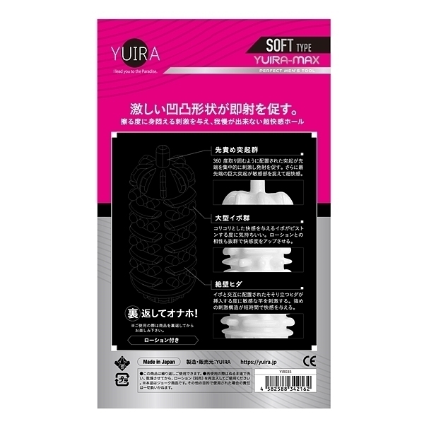裏返してオナホ!あの人気商品とYUIRAのコラボ実現!簡易オナホがソフトバージョンで新登場!ハードと違い、やわらか素材でアナタを優しく包み込みます♪<選べる3タイプ><安心の日本製><ローション付き>激しい凹凸形状が即射を促す、摩る度に身悶える刺激を与え、我慢が出来ない超快感ホール、先責め突起群、360度取り囲むように配置された突起が先端を集中刺激。最先端の巨大突起が敏感部を捉え超快感。大型イボ群、コリコリイボによりピストン運動する度に気持ちいい。ローションとの相性も抜群。絶壁ヒダ−イボとクロス配置されたそそり立ちヒダが何度もち〇ぽを刺激する。強烈刺激構造により短時間でフィニッシュ。※ご使用の際は本商品を裏返してからお楽しみください。 |