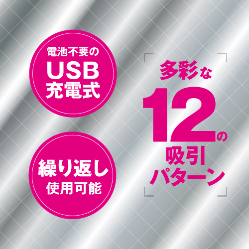 吸いすぎ注意!?パワフル吸引がクリを一点突破!多彩な12の吸引パターンを内蔵!乾電池不要のUSB充電式。 |