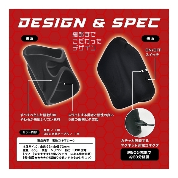 激コキ!衝撃快感が貴男を襲う!振動×シゴキによる、驚異の振動オナホールが新登場!いつもの手コキが、激烈快感のシェイクに大変身!!振動電源ONすれば、痺れるようなメガバイブレーション!さらに楽しめる振動アクションは、全10パターン!その激烈振動のハイパワーを実現させる、USB充電式バッテリー!本体内部の突起は、スライドするのにぴったりな5つの波形突起!すべすべとした肌触りの、やわらか高級シリコン素材!カチっと吸着する、マグネット充電コネクタ!約90分充電で、約60分稼働が可能!「スライド」は、上下にストロークする筒状モデル。いつもの手コキをバージョンアップする、ハンド拡張のような電動コキマシーン!バイブレーションを楽しみながらシェイクにスライドすれば、想像を超える夢の手コキ体験となるはず! |