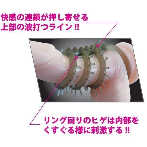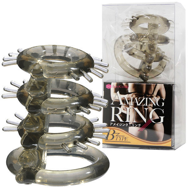 新しい刺激と快感に出会える!男根をしっかりと締め付け、持久力アップを強力にサポートする4連リング仕様の男性補助グッズ。タイプBは上部3つのリングに付いたトゲが、くすぐるように刺激を与える特殊形状!さらに連結部分の波形状が相手の敏感なところを責め立てます。また、リングを玉袋に通すか通さないかで体感する刺激が変化!いつもと違う快感と持続力で、貴方の日常を変えるペニスリングです。 |