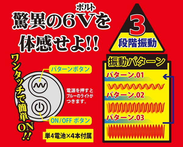 ボタンもワンタッチの簡単操作でシンプルに楽しめるブラックカラーのローターとなっております♪簡単な操作でパワフルな快感!6ボルトの振動を手軽に楽しめるシンプルなシングルローターで、振動パターンは強弱3パターンを内蔵。シンプル構造のシングルローターだから、どなた様でも手軽に6ボルトの振動をお楽しみいただけます♪ |