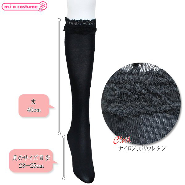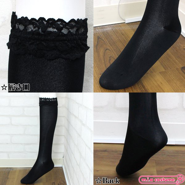 【50円★数量限定】ソフトナイロンレース付ハイソックス 黒 無地 40cm丈 23〜25cm<お一人様1点限り>