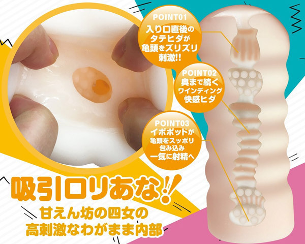 スケベ四姉妹と中出しSEX!甘えん坊四女アオイの高刺激オナホール「おなシスタ04 碧(AOI)」。『おなガール』の血を受け継いだ新シリーズ『おなシスタ』が登場!入り口直後の縦ヒダが亀頭をズリズリ刺激!奥まで続く快感ワインディングヒダを抜けた後は、イボポッドが亀頭をスッポリ包み込んで一気に射精へと誘います。 |
