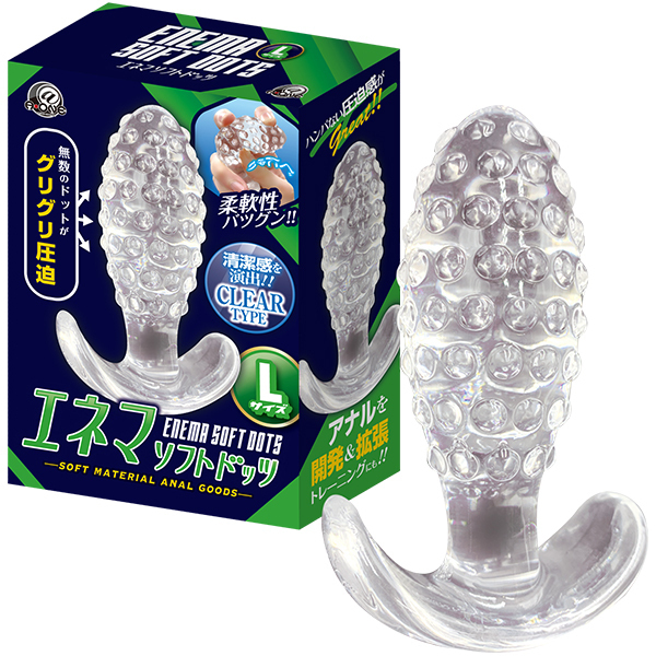 表面に配置された無数のドットイボによる圧迫感が心地良い「エネマソフトドッツL」です♪アナルの開発や拡張に最適なプラグで、開発レベルに合わせて3サイズから選ぶことができます。素材はソフトエラストマー製で柔軟性も抜群!挿れやすくて抜けにくく、丸洗いもできて何度も使用OK♪使いやすいストッパー付きでとっても安心!見た目も美しいクリアタイプのアナルプラグでこちらはLサイズ♪ハンパない圧迫感にアナルもびっくり!圧倒的な大きさをぜひお楽しみください♪ |