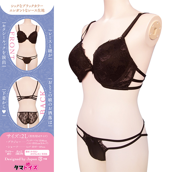 おとこの娘専用デザインの本格ブラ&ショーツセットが登場♪下着から可愛くお洒落を楽しみたいあなたへ!股間にはワレメカップ付きで、綺麗なくっきり一本筋をリアルに再現♪ショーツの食い込み面はパッドでしっかり成形、魅惑のキャメルトゥを演出します!ヒップはシースルーレースで大胆セクシーなハーフバック仕様♪ブラはワイヤー&着脱可能パッド入りで胸元をふっくらボリュームアップ!レースと紐が絡み合うセクシールックは、可愛いのに着け心地も快適です♪おとこの娘にぴったりの2Lサイズ(男性用M相当)でフィット感抜群!胸囲約93cm、ヒップ97〜105cm対応で美しいシルエットに♪こだわりの日本デザインで、おとこの娘ライフを華やかに演出します!●TMT-1817 |