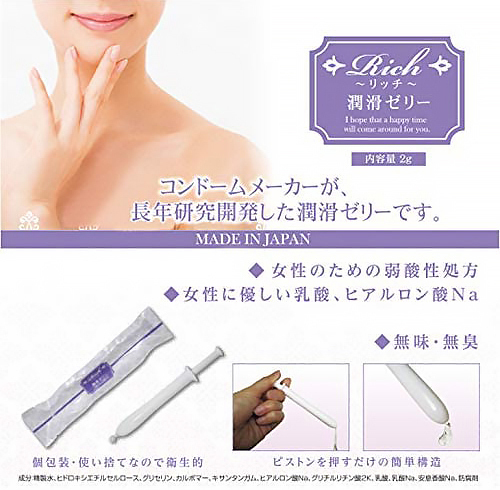 コンドームメーカーが長年研究開発した潤滑ゼリーです。潤い不足で悩む女性のために作った弱酸性処方で女性に優しい乳酸ヒアルロン酸Na。●急性毒性試験済みなので安心してお使いいただけます●無色透明・無味無臭の潤滑ゼリー●注射器型だからワンタッチで手を汚さず衛生的●ピストンを押すだけの簡単構造●個包装・使い捨てなので衛生的。30本入り |