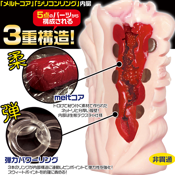 肉厚の外壁&トロトロ膣内素材の間に、3つのリングを内蔵した新発想のオナホール。肌色の側面にもビラビラを刻み込み、ちょっとしたグロさをアピール!膣括約筋・Gスポット・ポルチオにある、3つのパワーリングの弾力で、まるで三段俵締めの名器のような吸い付き&締め付けを味わえる、非貫通型・無次元オナホールです。ペニスが欲しくてたまらず、欲情しちゃったアソコをご堪能ください! |