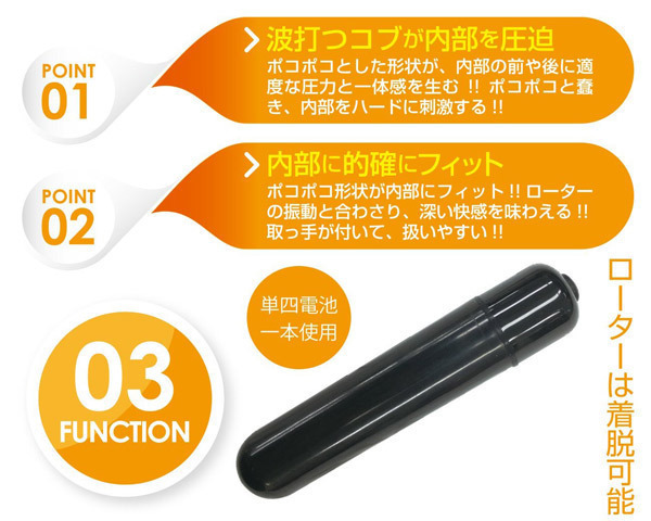 波打つ連続コブでハードに圧迫!挿入しやすいスティック型アナルバイブ「プロクトスティック キュー」。●串団子のような高弾力ボディ●徐々に太くなる連続コブ突起●適度な圧力を生むポコポコ刺激●扱いやすいグリップリング付き●腸全体に響き渡るローター振動●三段階の振動強弱切り替え搭載●内蔵ローターは取り外し可能。ポコポコ形状が内部にフィット!前後に適度な圧力と一体感を与えて下半身を震撼させる電動アナルグッズ。スリムなスティックタイプながら、連続コブでしっかりとした挿入感に!さらに、ローターの振動との相乗効果でより深い快感を味わえる次世代型のスティックバイブです。※電池周囲の保護用シートは外さないでください。 |