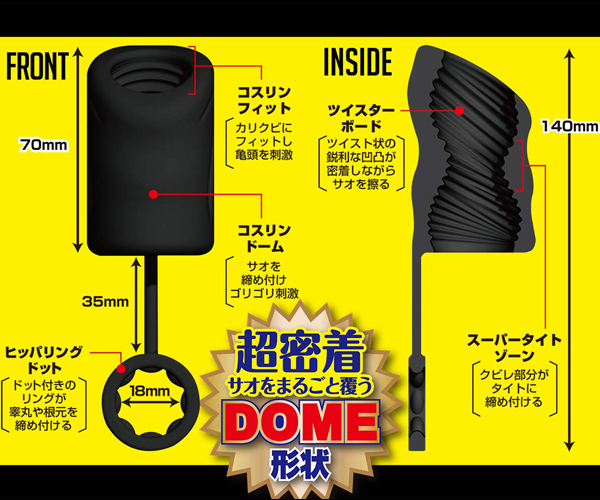 あのコスリングがパワーアップして帰ってきた!手コキ以上の快感×オナホ以上の衝撃が押し寄せる…ッ!新感覚オ〇ニーグッズ第2弾!!睾丸や根元を締め付けるリングはドット付きに進化し早漏防止&勃起力UP!!竿をまるごと覆う超密着なDOME形状が全体を包み込みハードに締め付ける!ツイスト状の凹凸がゴリゴリと責め、内部のクビレ部分が単調ではない刺激を生み出します。自由に擦るだけで最高の射精感、まさにストライクな一撃!普通の手コキでは得られない圧迫感、オナホの煩わしい後処理にサヨナラ! |