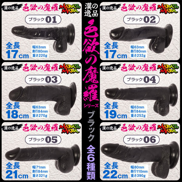 maccos japanのディルドブランドMARAMARAから【色欲の魔羅シリーズ】の登場です。少しワインディングしたサオのフォルムが特徴で、カリの張り出しも強めで、引っ掛かりが心地よいタイプ。全長17cm、最大径3.9cm、挿入長12cm。ブラックカラーの色欲に溺れるリアルな外観と感触がたまらない!本物志向のスタンダードなディルドです。02は先端が大きく、ピストンでの掻き回しに最適。適度な弾力と硬さを兼ね備え、本物以上の質感は貴女を虜にすることでしょう。床、壁、浴槽とどこにでも張り付く強力吸盤付きで楽しむ場所を選びません。初心者から上級者までしっかりと楽しむ事が出来ます。 |