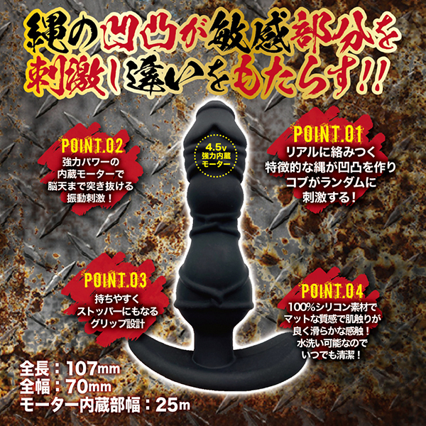 ペニスが緊縛されているような独特の形状の挿入シャフト、そして強弱を含んだ10種類のバイブレーションで穴の中を振動攻めしてくれる「メスイキ クレイジージャンキー (緊縛)」です。敏感な部分を強力な振動と独特な凸凹が刺激して悶絶必至♪4.5Vの強力パワー&10ファンクションシステム搭載&100%シリコンの強力イカセプラグ!抜き差しして楽しむも良し、挿れっぱなしでバイブ機能を堪能するも良しの優秀バイブです。 |