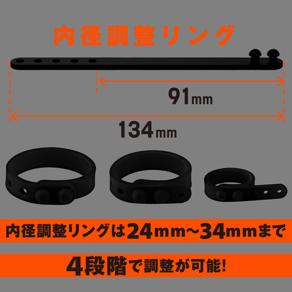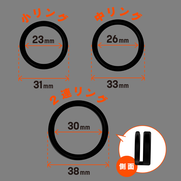 しっかり固定して外れにくい!高品質シリコンの弾力性に優れたペニスリング。ベタつきのないサラスベ質感で着け心地抜群!一つだけ使うも良し同時装着もOK♪皮戻り防止や持続力アップなどシチュエーションに合わせてお使いください。内径23mmの小サイズ、26mmの中サイズ、30mmの2連リング、そして自分の身体に合わせてサイズ変更できる内径調整リングの4個付属。 |