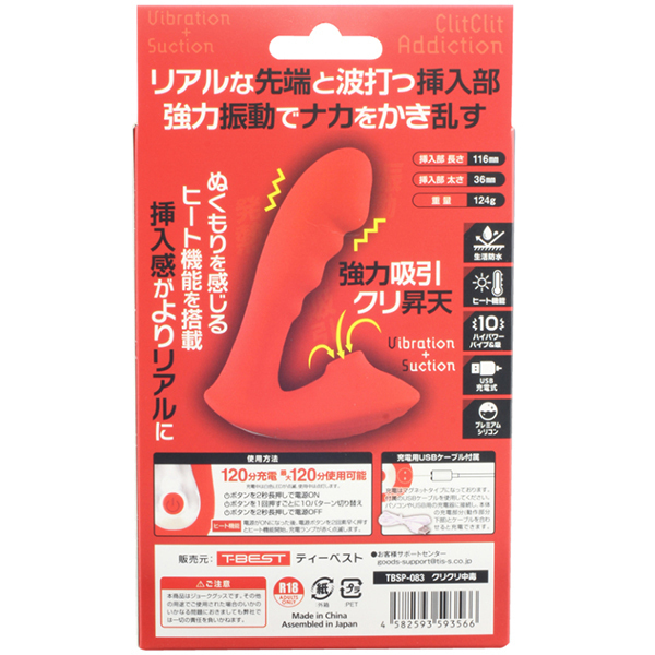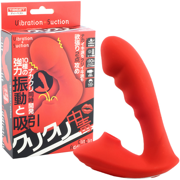 これさえあれば中イキ派もクリ派も大満足の欲張り2点攻めバイブ「クリクリ中毒」。リアル形状の先端が挿入感をしっかり感じさせながら波打つ挿入部が腟内をしっかり振動してくれます♪クリ吸引も強力でハイパワー!クリトリスを攻め立てながらGスポットも刺激する2点攻めで快感も最高潮♪10種類の強力振動と吸引機能でナカも外も同時に開発しながらイカせてくれます。ぬくもりを感じるヒート機能を搭載しているので寒い日でも冷たくなく、人肌の暖かさで挿入感がよりリアルに感じられます♪高級シリコンを使用しているので肌触りも最高。生活防水仕様なのでご使用後はしっかり水洗いが出来ます♪電源はUSB充電式でフル充電120分で連続稼働120分です。 |