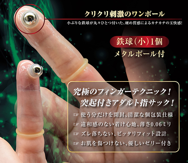 普通の指挿入だけでは物足りない!そういうときに役立つのが「フィンガースキンDX (G−6)」。コリコリとした刺激が味わえるメタルボールが指先についたラブグッズ版の指サック!コリコリ、トントンとこれまでの指挿入では味わえない刺激が楽しめるほか、Gスポットやアナルに挿入して前立腺を刺激するなど男女兼用でお楽しみ頂けます♪鉄球はしっかり台座に固定されているので簡単に外れるような心配は不要!使うことで心地良い異物感が味わえるので細めのローターやディルドに被せて使うのも◎。表面にはゼリーが塗布されていて挿入しやすく衛生的♪気持ちいいところをピンポイントで刺激するのに最適です! |
