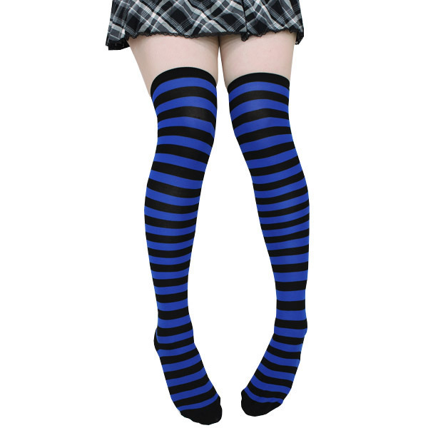 コスチュームのアクセントに!ブルー×ブラックのボーダー柄ニーハイ。1cm幅の細めボーダーがとってもキュート!コスプレ衣装はもちろん、私服にもコーディネート出来ちゃう優れもの!ヘビロテ確実のしましま柄ニーハイソックスです。※こちらの商品は在庫の状況によりお届けまでに4日〜7日程度かかる場合がございます。 |