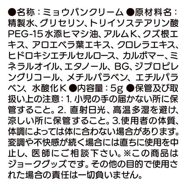 やさしく塗り込むだけでリラックスをサポートする女性用クリームです♪アロエやハーブ由来の保湿成分を配合し、敏感な部位にもなじみやすい設計になっています!しっとりとした塗り心地で、じんわり広がる感覚が心地よさを演出します♪使用方法は簡単で、適量を手に取り気になる部分にやさしく塗布するだけ!パートナーと一緒に使う際は、必ず相手の同意を得てからご使用ください♪持ち運びに便利な5mlサイズで、旅行や外出時にも活躍します!日本製で成分や製造にもこだわり、安心して使える仕様です♪普段使いのケアや特別なシーンでのサポートとしてもおすすめです!ジョークグッズとしても楽しめる、気軽に使えるアイテムです♪ |